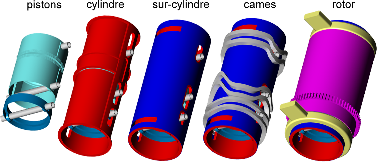 conserve du moteur traditionnel les éléments suivants : Principe Chaque piston dispose d' un mouvement forcé par la forme des ses cames, le déplacement des pistons ouvre ou ferme les lumières d' admission et d' échappement situées sur le cylindre. ce principe permet d' obtenir les 4 cycles d' un moteur conventionnel sans soupapes ni distribution.