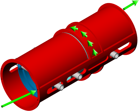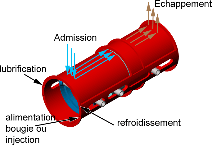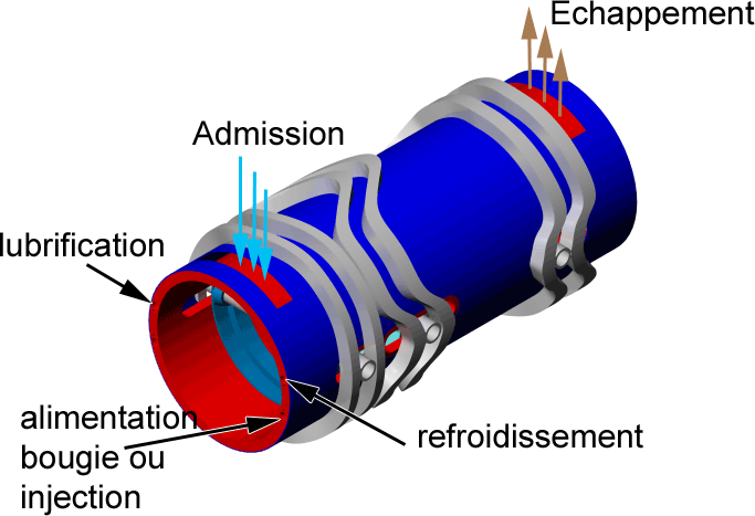 Circulation des gaz Le sur-cylindre (en bleu) sépare les volumes d'admission, d'échappement et de refroidissement. Ces volumes indépendants ne sont jamais en communication entre eux et sont parfaitement délimités. L' admission et l' échappement qui couvrent environ deux fois 150° disposent d'une section importante ce qui favorise l' écoulement des gaz donc un remplissage du cylindre plus complet et des pertes à l'échappement réduites. La vue de droite sans
